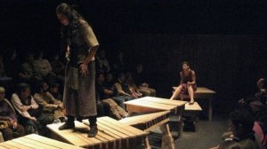 El auditorio del Foro Shakespeare se adaptó para tener gradas a los dos lados dejando el escenario al centro. Una sencilla escenografía compuesta de varias mesas se convierte en momentos lo mismo que un sendero tosco de bloques de madera, el piso de una casa, un escritorio. Arriba una una hilera de lamparas ilumina el escenario. En momentos las columnas y el recinto de madera dan la sensación de estar en un edificio japonés.