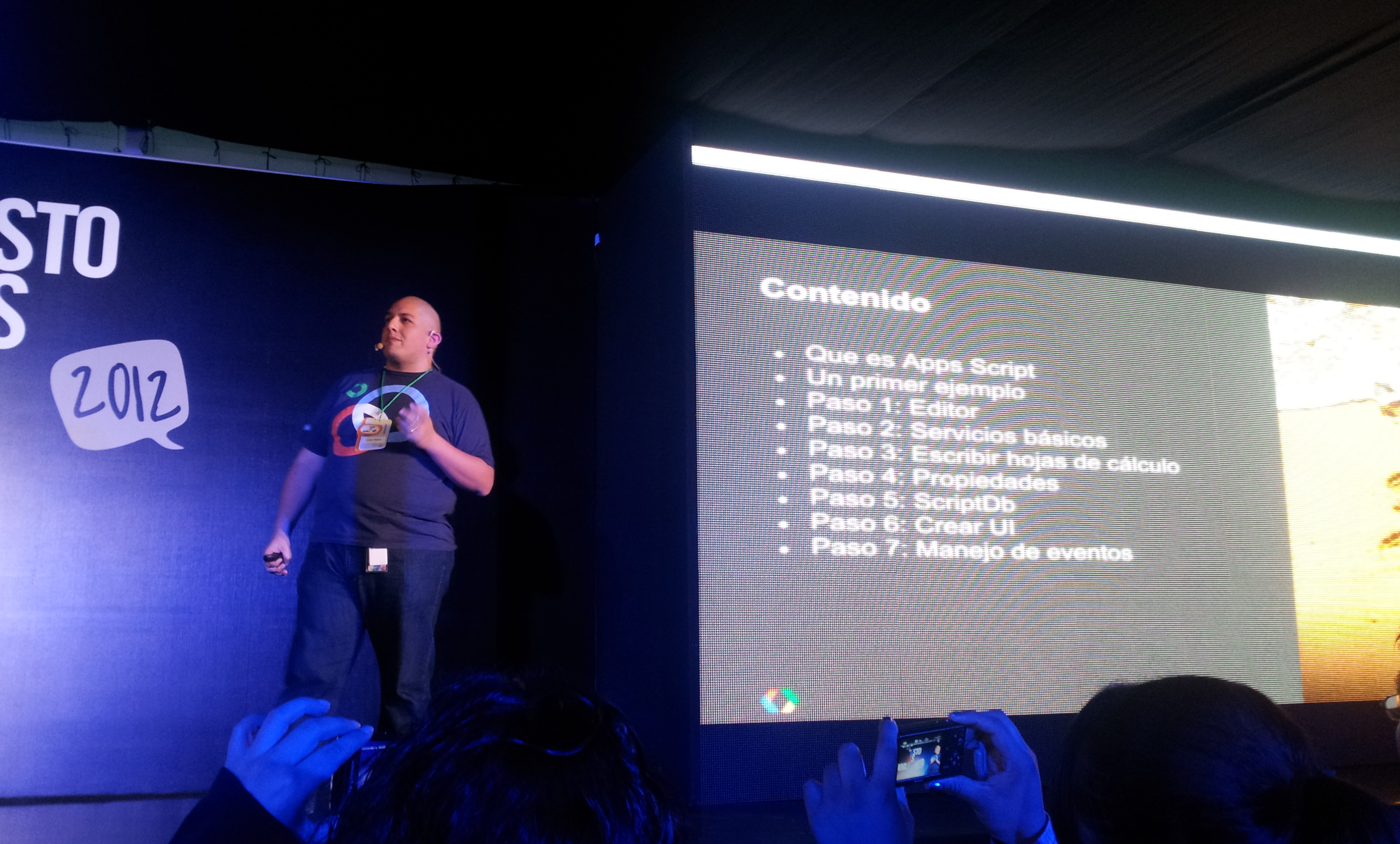 La última plática a la que entré fue «Apps Script en 7 pasos» con Arturo Vázquez de Google México. Apps Script es una tecnología basada en javascript que permite automatizar y conjuntar tareas entre varios productos de Google. Estuvo interesante y el código se ve muy simple aunque a mi gusto falto verlo correr.