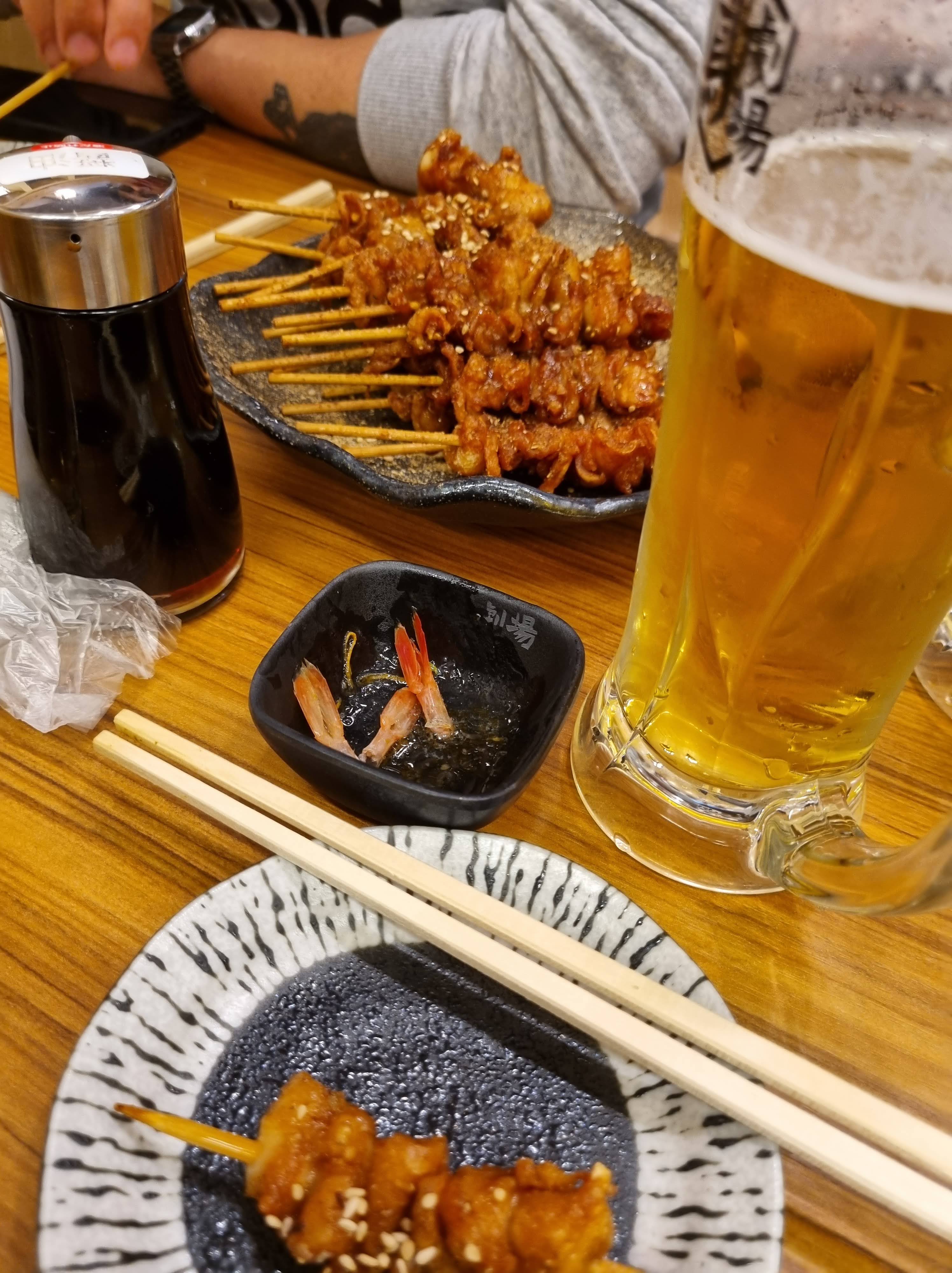 Aunque estoy lleno, acompaño a Enrique y a otros a cenar cerca del hotel. Vamos a un barcito a tomar cerveza acompañada de brochetas hechas de menudencias (piel de pollo frita, mollejas y no sé qué más). Las brochetas no están mal pero tampoco son mis favoritas. La cerveza nos gusta mucho.