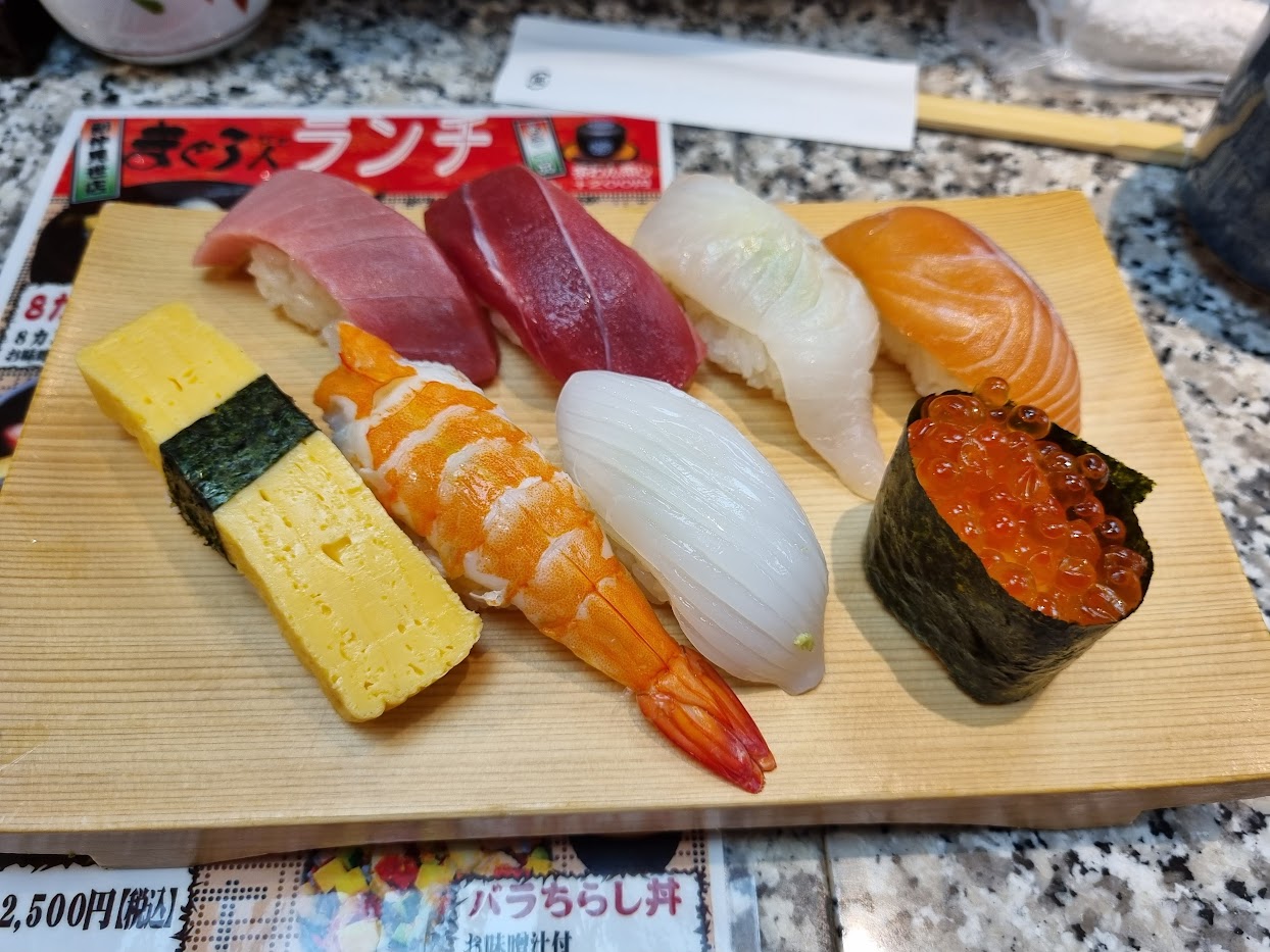 Aqui nos dejan libres y vamos curiosear por las calles y buscar algo de comida. En mi caso fue una de las más memorables del viaje, una tabla de nigiris que incluye su sopa miso y té verde por un total de 1300 yenes, unos 170 pesos mexicanos.