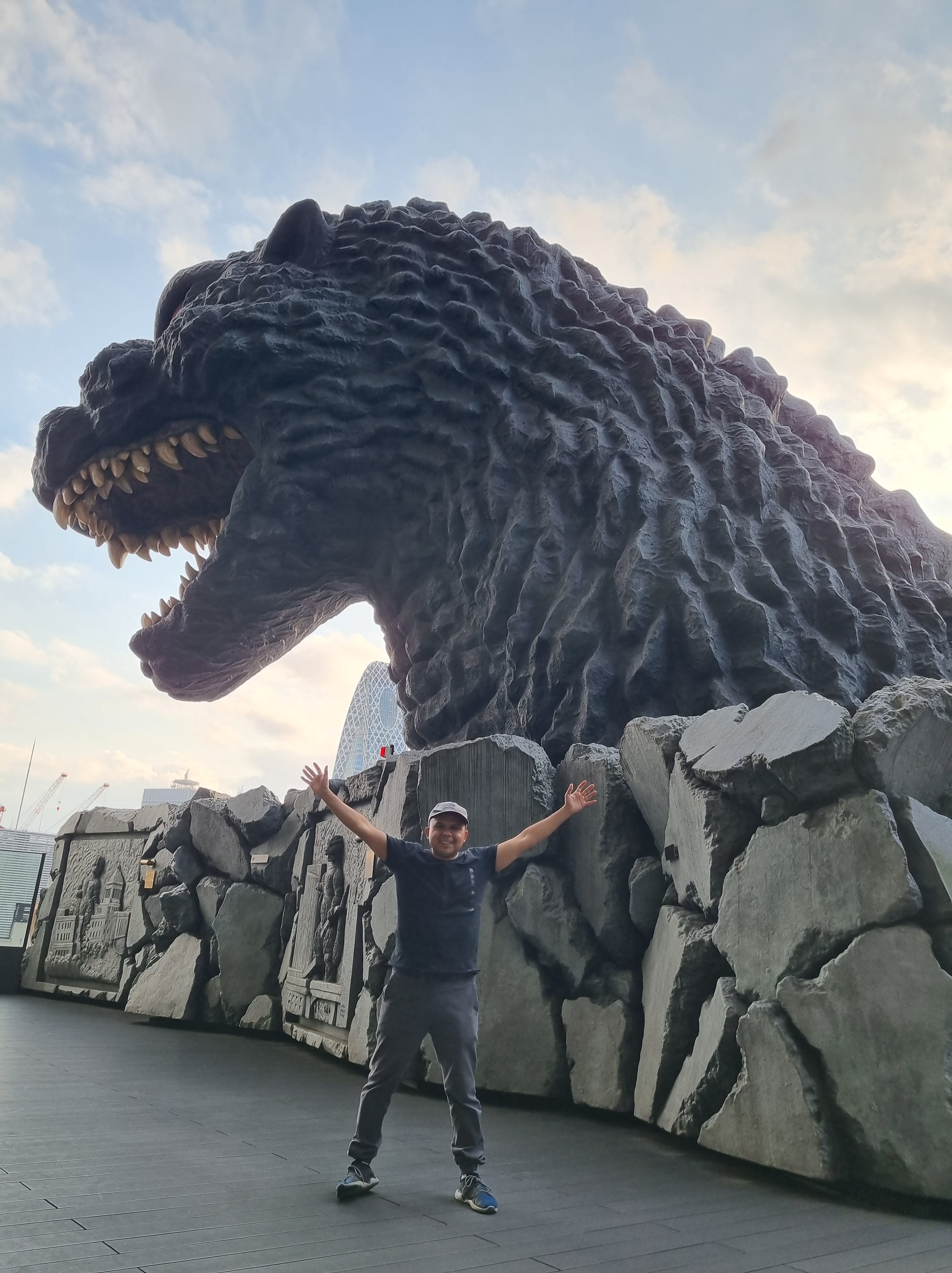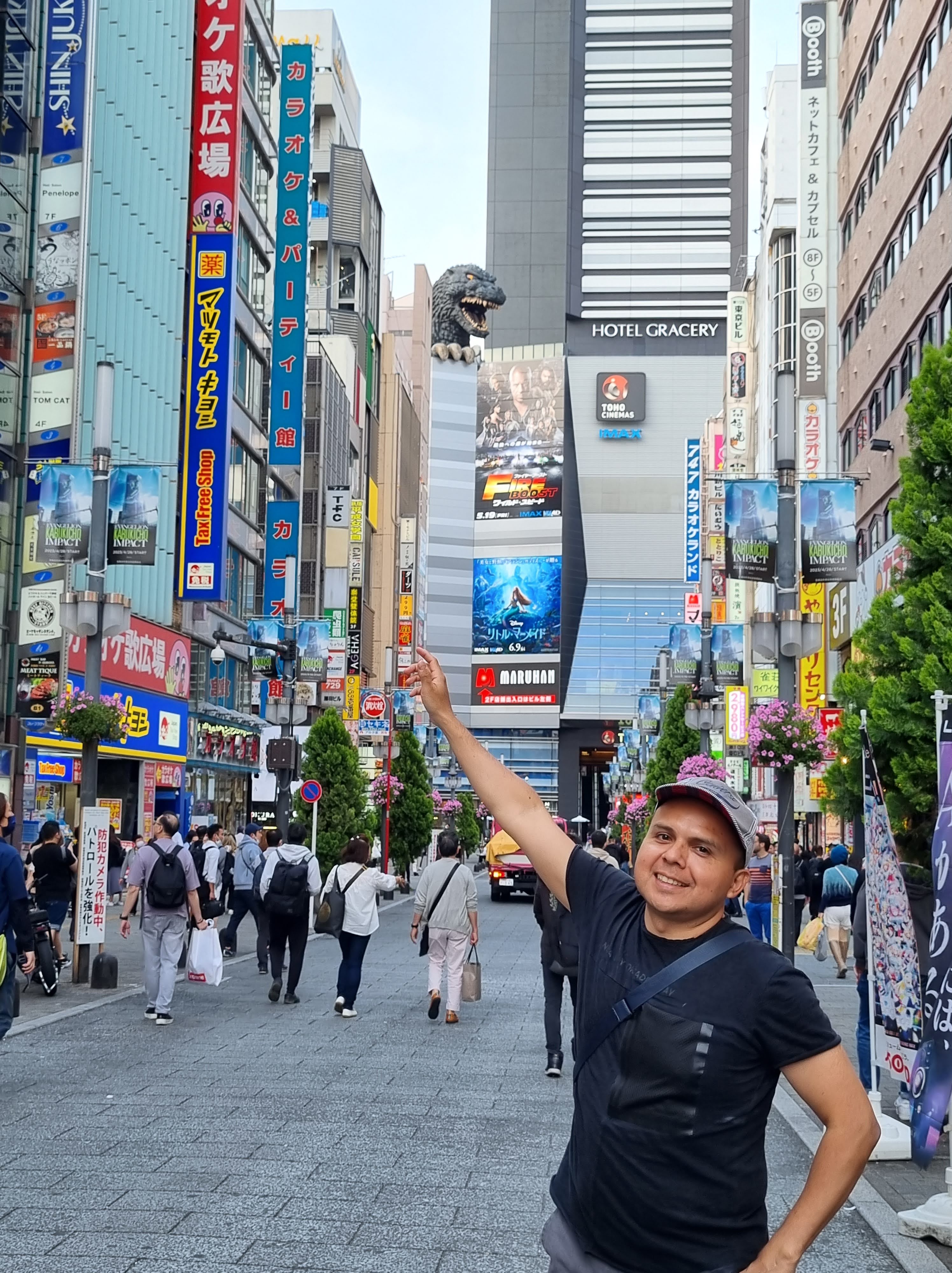 Cuando ya comenzaba a atardecer fuimos a Shinjuku a visitar la figura y la cabeza de Godzilla en el Hotel Gracery. Sobre la Central Road, en la foto que salgo señalando a Godzilla, nos encotramos a chicos y chicas que ofrecen servicios de plática. A los japoneses se les advierte tener mucho cuidado, pues ejercen un tipo de estafa parecida a algunas que se hacen aquí en CDMX: si tú le sigues por algún motivo la conversación, en cuanto intentes retirarte ellos te dirán que debes pagarle por sus servicios y tendrás que darles algo de dinero. Por fortuna, como dije anteriormente, el turista que no habla japonés no suele ser objetivo de estas personas.