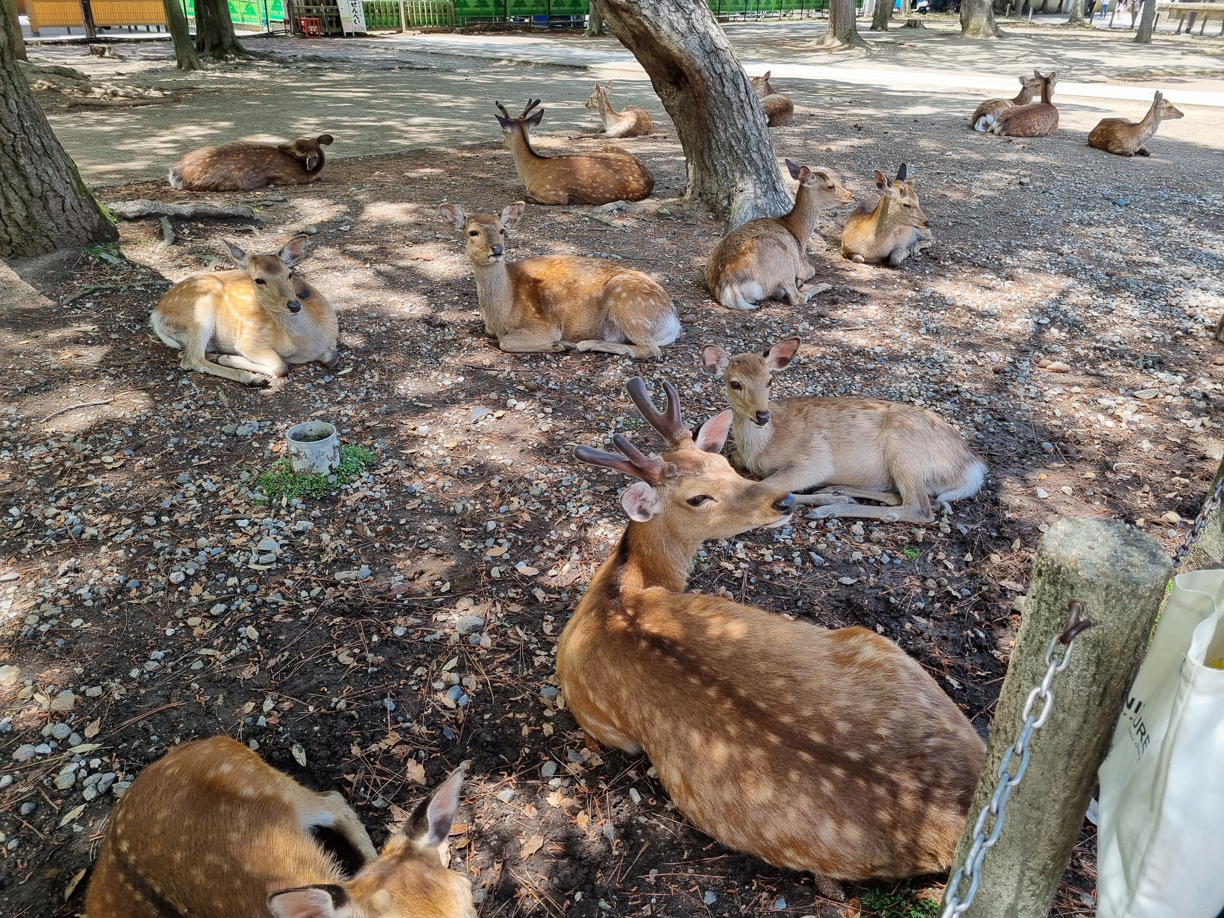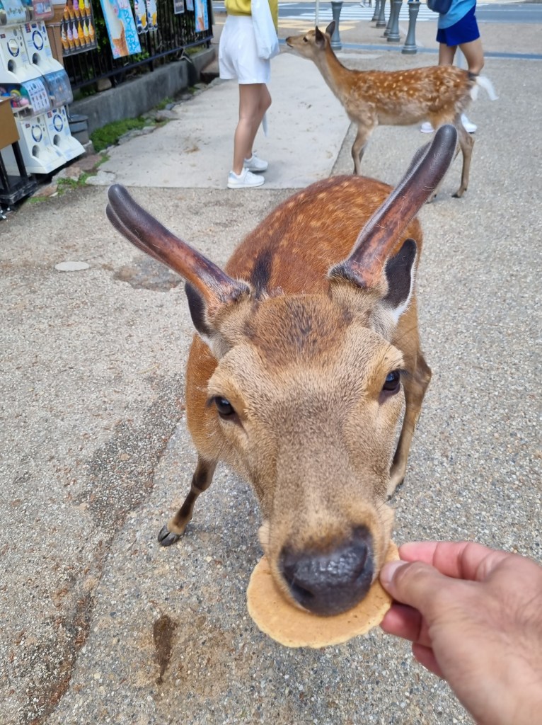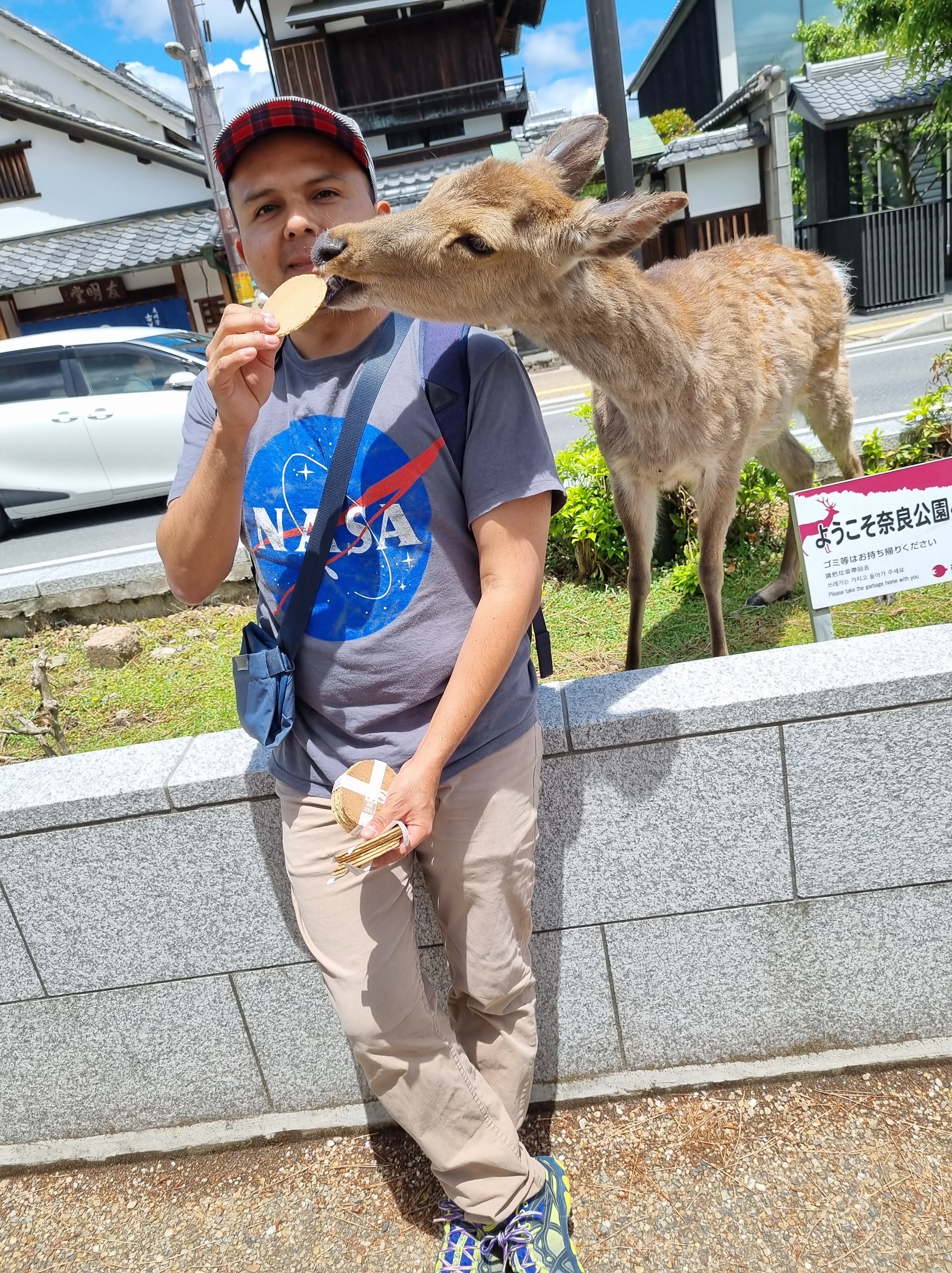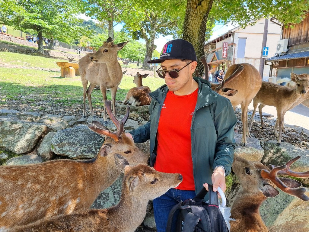 Luego del desayuno partimos para Nara, donde nos espera una población de poco más de mil venados sika en total libertad. La experiencia no decepciona. Les compramos galletas que venden especialmente para ellos y eso nos da la oportunidad de tomarnos fotos increíbles. Sin embargo, hay que tener cuidado de no tener demasiados a nuestro alrededor exigiéndo con ligeros topes de cabeza que les alimentes y intentando comerse tu ropa y tus pertenecias.