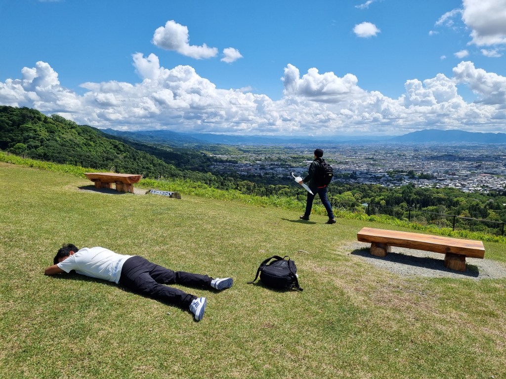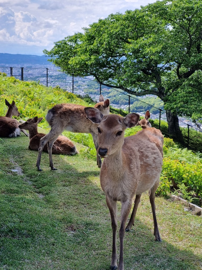 En la colina vivimos una de las anécdotas más graciosas (y caras) del viaje. Por descuido la mochila de Lalo se queda abierta. Un curioso venado la encuentra y mete su cabeza, Lalo y Enrique corren a detenerlo pero es demasiado tarde. El venado saca los billetes de yenes, Enrique consigue arrebatarle casi todos, pero el venado le gana y se come el de denominación más grande: 10,000 yenes. El equivalente a unos 50 paquetes de galletas.