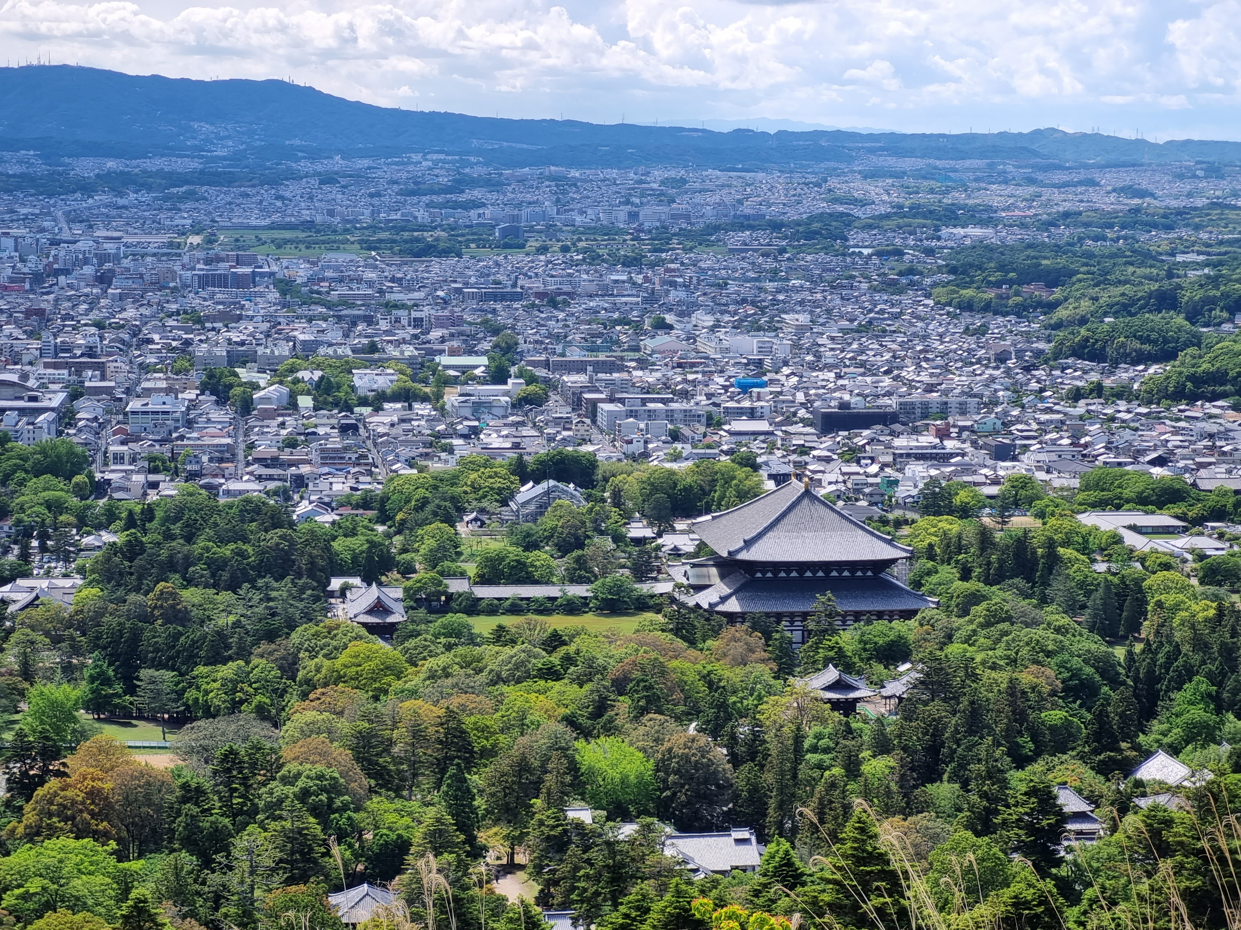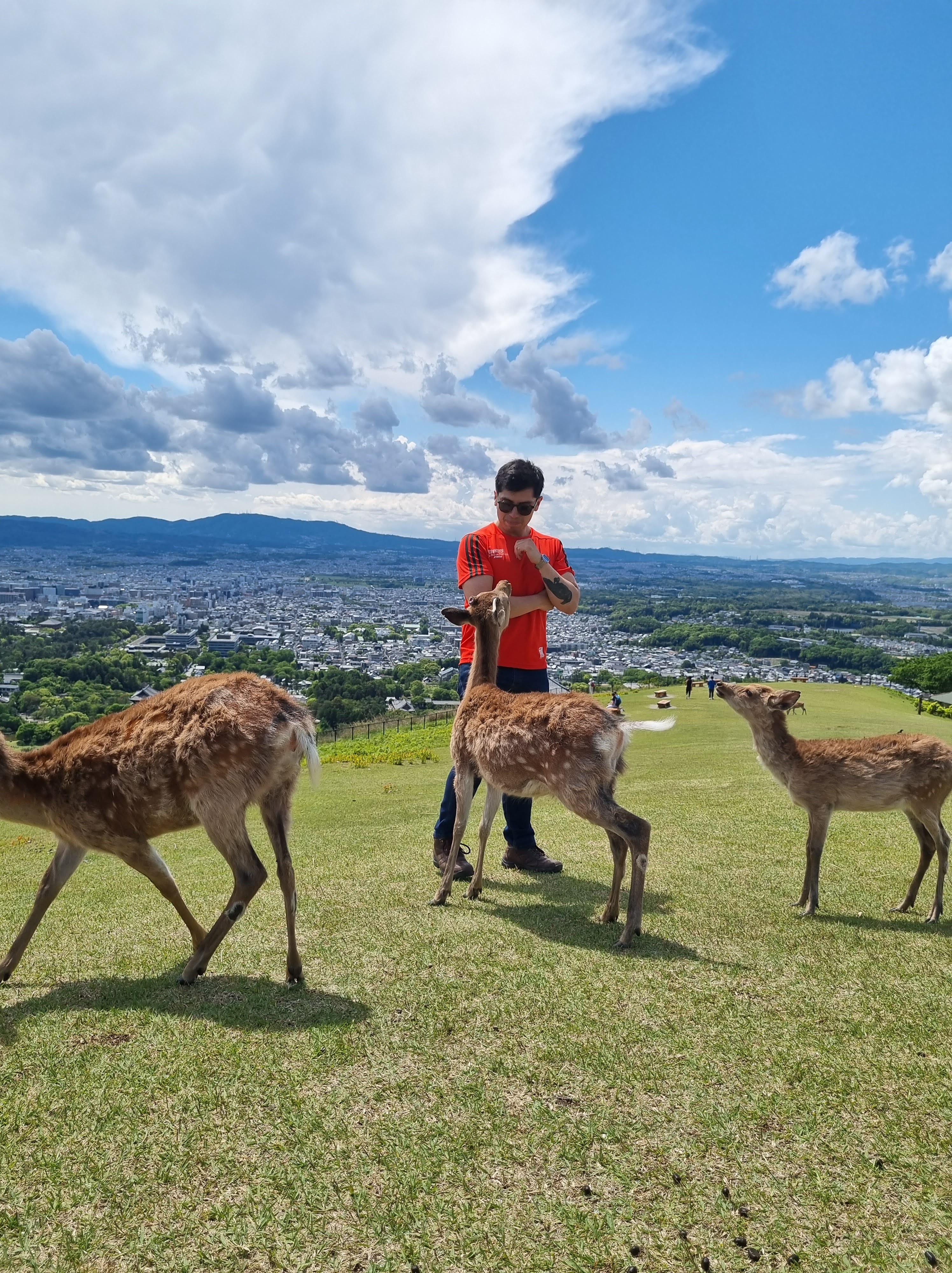 Finalmente, y ya acostumbrados a ‘trepar cerros’ y caminar no menos de 10 km, subimos hasta la cima de la colina donde nos esperan más venados y desde donde podemos ver Nara y sus alrededores. Desde este punto se puede ver el templo Tōdai-ji y hacerse una idea de lo impresionante que debió verse la versión original.
