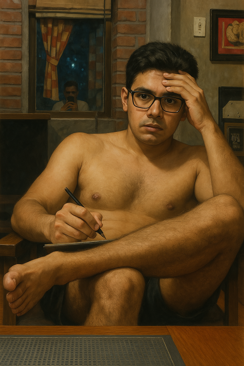 Le tomé una foto a un amigo. Él usaba playera y miraba su cuaderno. Le pedí a ChatGPT que la volviera a dibuja con un estilo realista y él sin playera y mirando al frente. El resultado me pareció sumamente increíble y hermoso. Incluso me pareció lindo el detalle de dibujarme «a mi» en el fondo, en el reflejo del vidrio de la ventana capturando el momento, dando el toque voyerista.